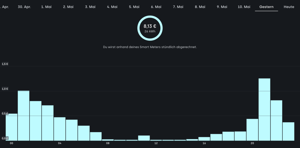 Am 11. Mai war es das erste Mal soweit: Wir hätten Geld verdienen können, wenn wir Strom bezogen hätten. Von 12 bis 15 Uhr fielen die Strompreise in den negativen Bereich, wie in der ersten Grafik aus der Tibber-App zu sehen ist, obwohl auf die Nettostrompreise noch diverse Abgaben und Steuern aufgeschlagen werden. Zwischen 14 und 15 Uhr wären uns für jede von Tibber bezogene Kilowattstunde Strom acht Cent vergütet worden. Es war sonntags und PV-Anlagen und Windräder erzeugten überdurchschnittlich viel Strom.